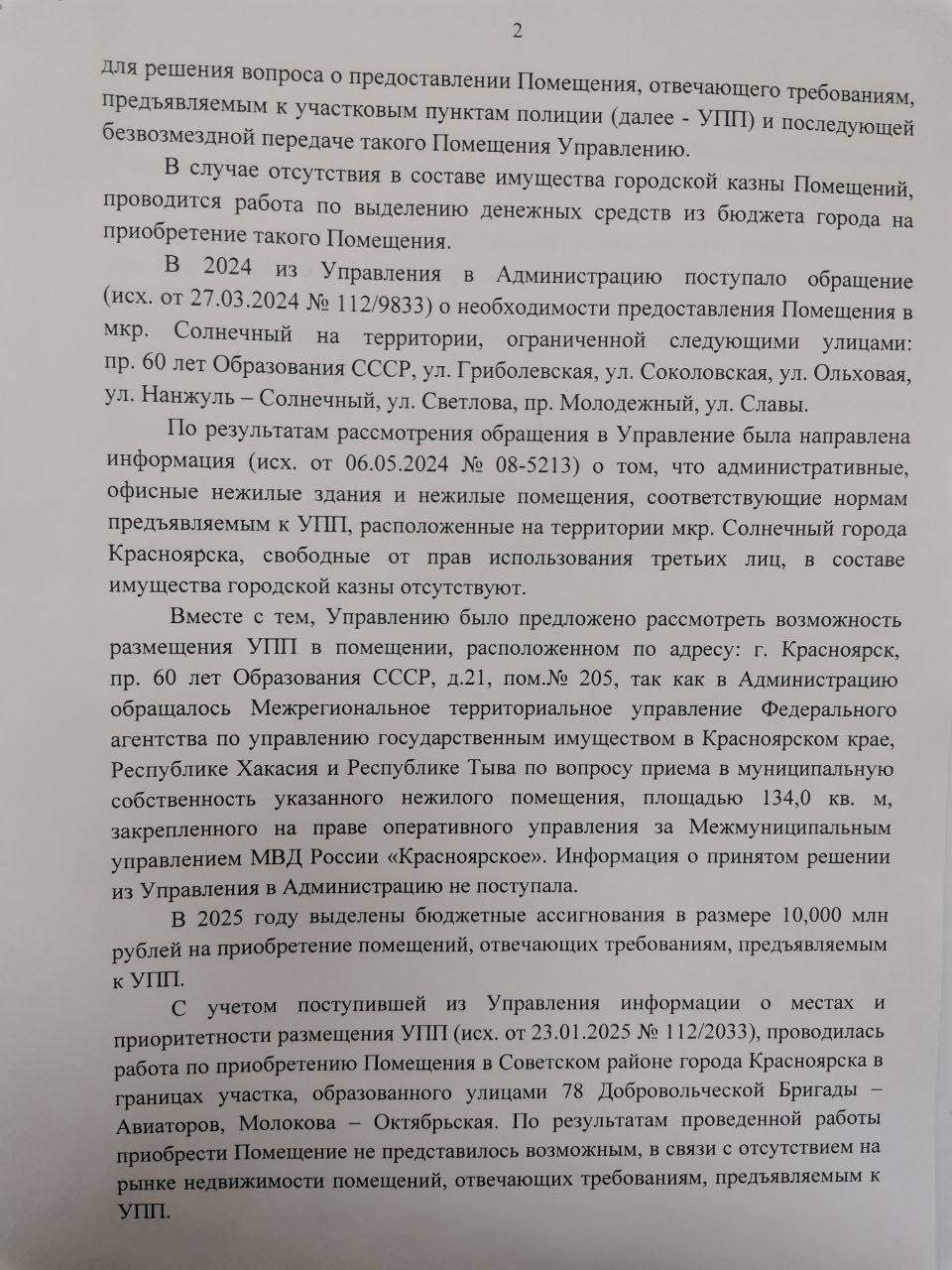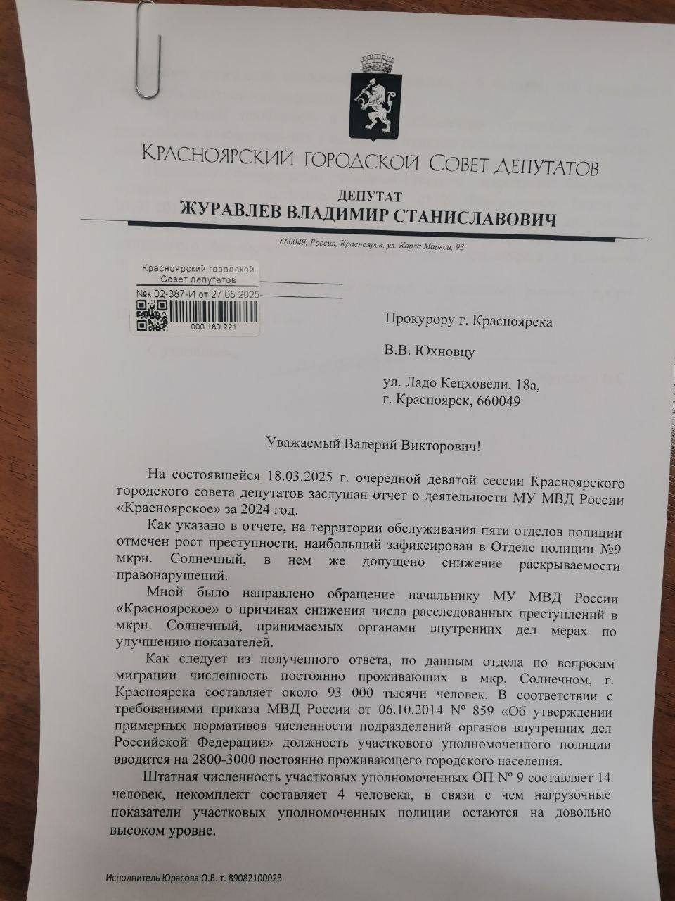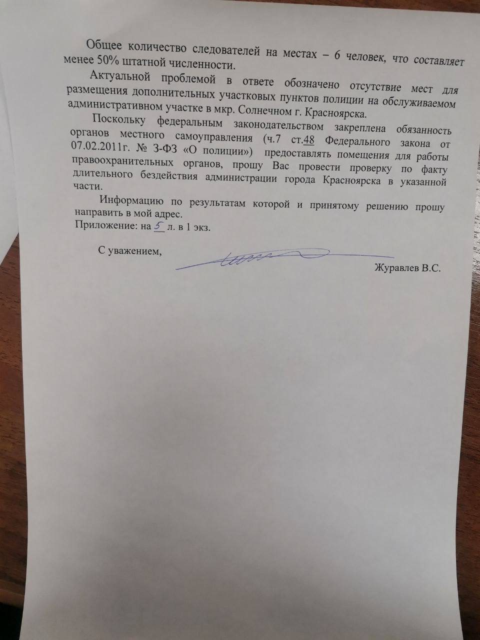 В связи с тем, что вопрос не решается длительное время, Владимир Журавлёв направил обращение в прокуратуру города по факту бездействия администрации в обеспечении полиции необходимыми помещениями.