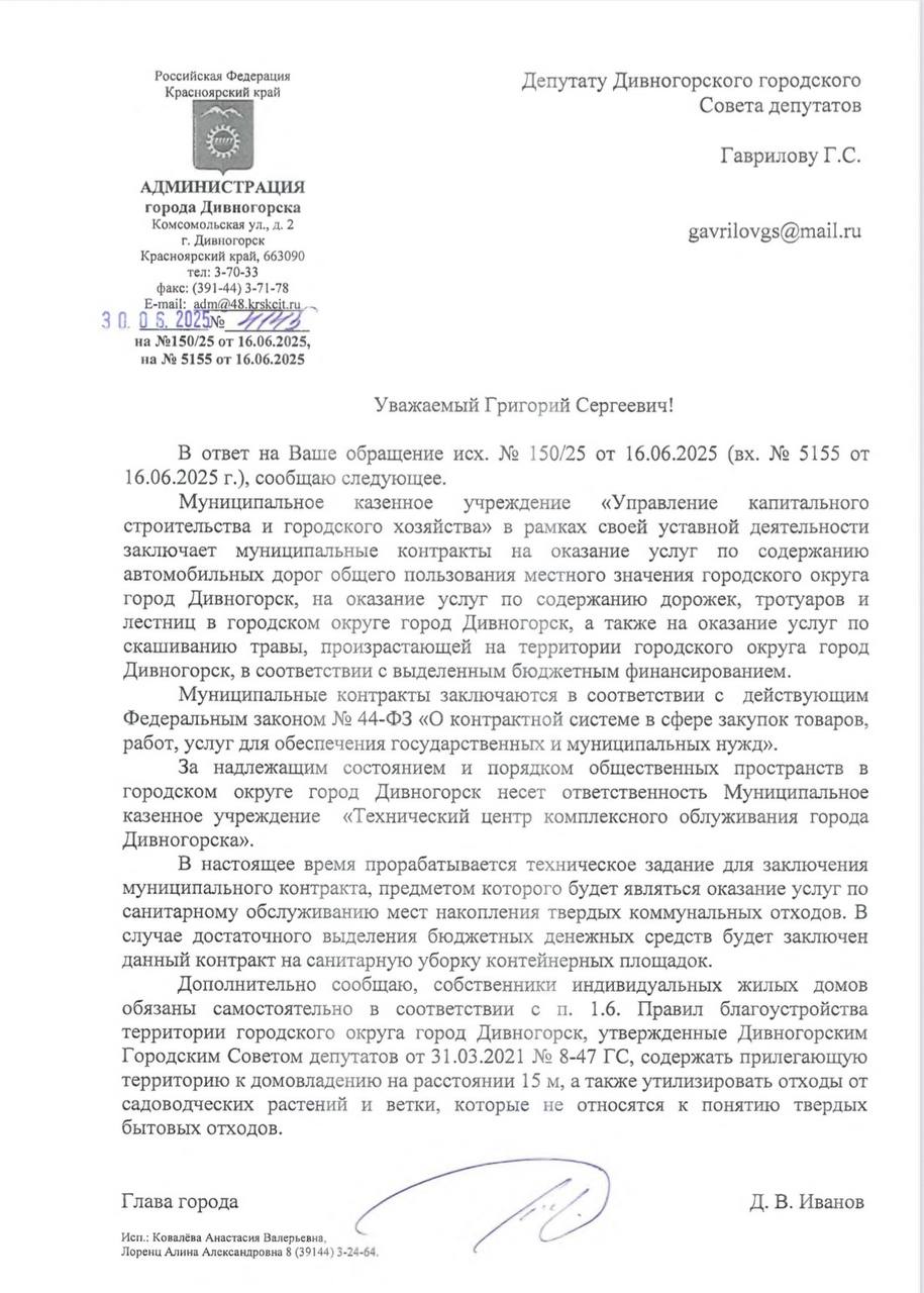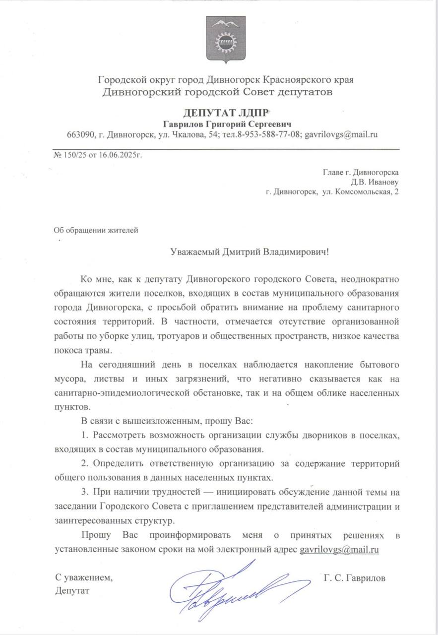 По обращению жителей поселков Дивногорске депутат ЛДПР Григорий Гаврилов направлял запрос в адрес главы, в котором чётко поставил вопросы порядка