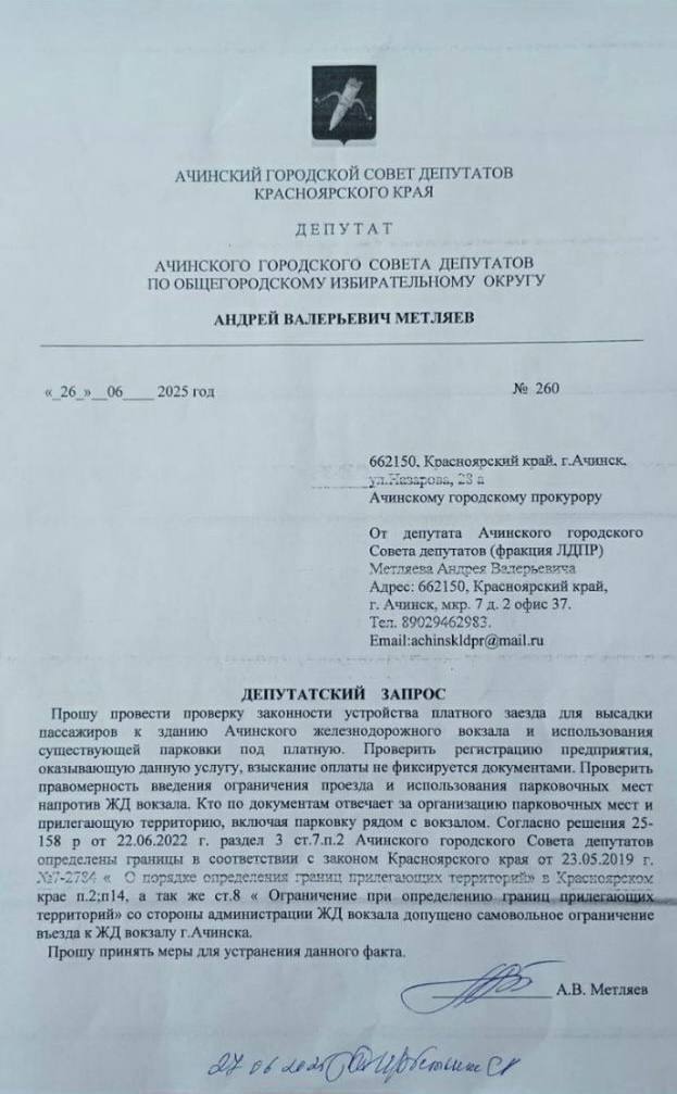 В адрес депутата Ачинского городского Совета Андрея Метляева поступило обращение от жителей города, возмущённых тем, что парковка перед зданием железнодорожного вокзала, ранее находившаяся в свободном доступе, внезапно стала платной