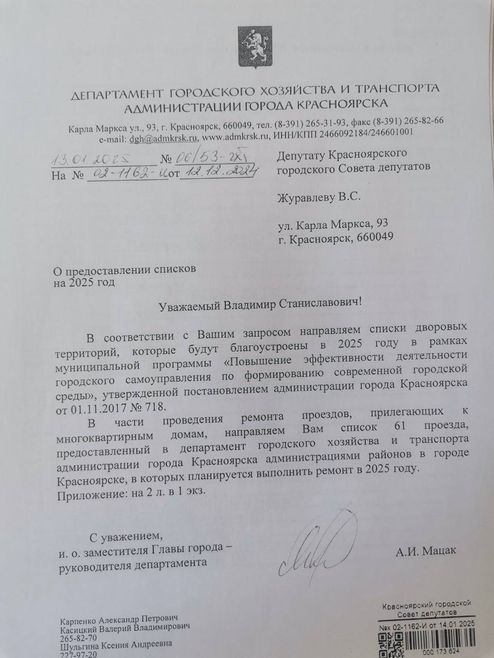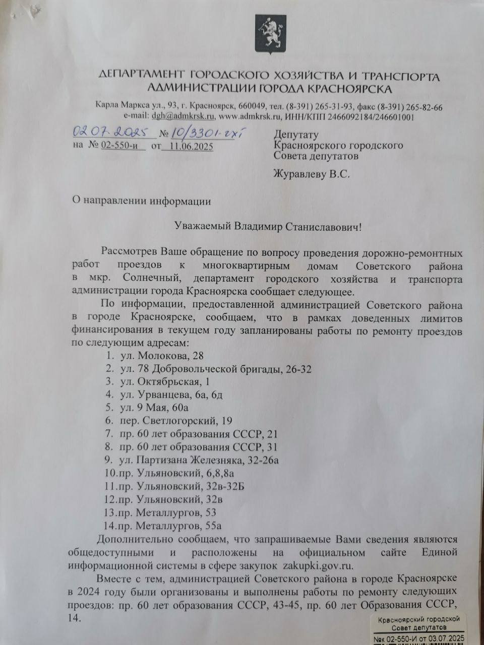 Владимир Журавлев направил депутатский запрос в администрацию, чтобы прояснить сроки начала и окончания работ, а также выяснить, почему к ним ещё никто не приступал. Ответ департамента городского хозяйства озадачил ещё больше.