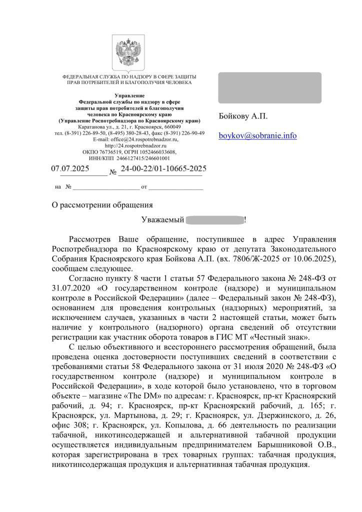 «Считаю, что ситуация с вейпшопами в городе давно вышла за рамки нормы. Многие из них работают почти в открытую с нарушениями, торгуют несертифицированной продукцией и располагаются там, где особенно уязвимы дети и подростки. Такая «альтернатива» табаку на деле представляет реальную угрозу здоровью. Государство должно реагировать на это жестко, и я, со своей стороны, продолжу добиваться системных проверок и наведения порядка в этой сфере», — рассказал Алексей Бойков.