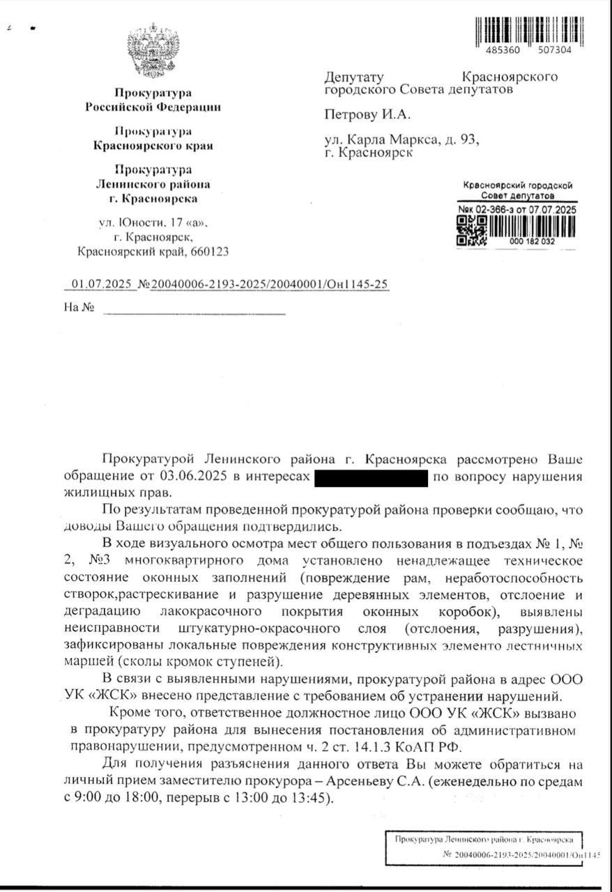 Только необходимые работы до сих пор не выполнили. УК говорит, что не могут найти подрядчиков. Обращения жильцов в различные инстанции результата не дают. Иван Петров посредством депутатского запроса обратился в прокуратуру. По результатам проведенной прокуратурой Ленинского района проверки, доводы жильцов дома подтвердились.