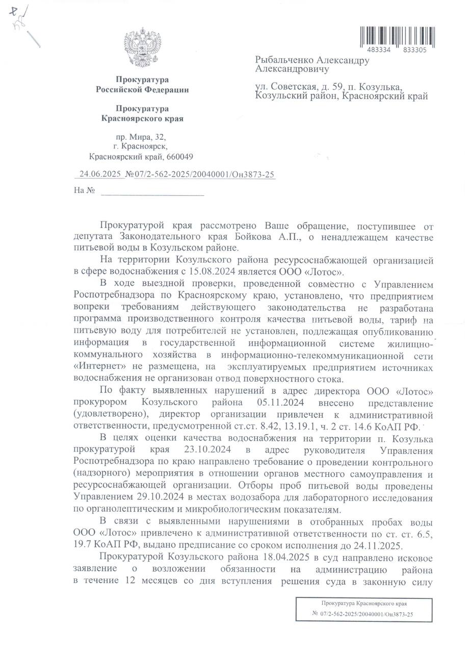Настоящая отличная новость, которая вселяет уверенность, что за недобросовестную работу всегда придётся отвечать. Долгие годы жители Козульки и Козульского района жаловались на некачественную воду, а депутат районного совета от ЛДПР Александр Рыбальченко, в том числе как местный житель, добивался решения этого вопроса. За помощью он обратился к лидеру фракции в Заксобрании края Алексею Бойкову, который, в свою очередь, привлек внимание краевой прокуратуры к проблеме