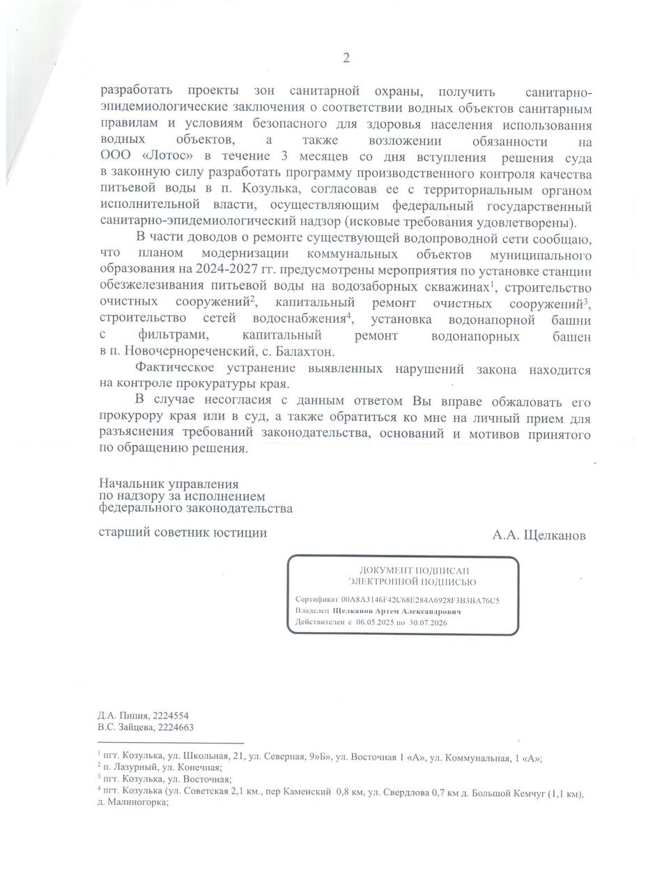 Также прокуратура инициировала лабораторные исследования проб воды. Надзорное ведомство сообщило, что в 2024–2027 годах планируется ремонт и модернизация сетей водоснабжения, строительство и ремонт водонапорных башен и очистных сооружений. Все меры прокуратура взяла на особый контроль. Это внушает надежду, что устранение нарушений случится, и у людей появится вода соответсвующего качества.