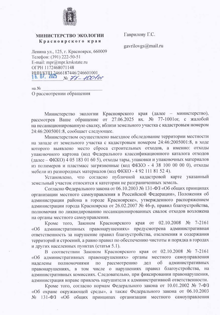 Депутат ЛДПР Григорий Гаврилов получил официальный ответ от Министерства экологии Красноярского края по жалобе на несанкционированную свалку вблизи улицы Дорожно-ремонтный пункт в селе Овсянка. Выездная проверка прокуратуры подтвердила факт незаконного сброса строительных и бытовых отходов — картон, пластик, мебель — в лесном массиве