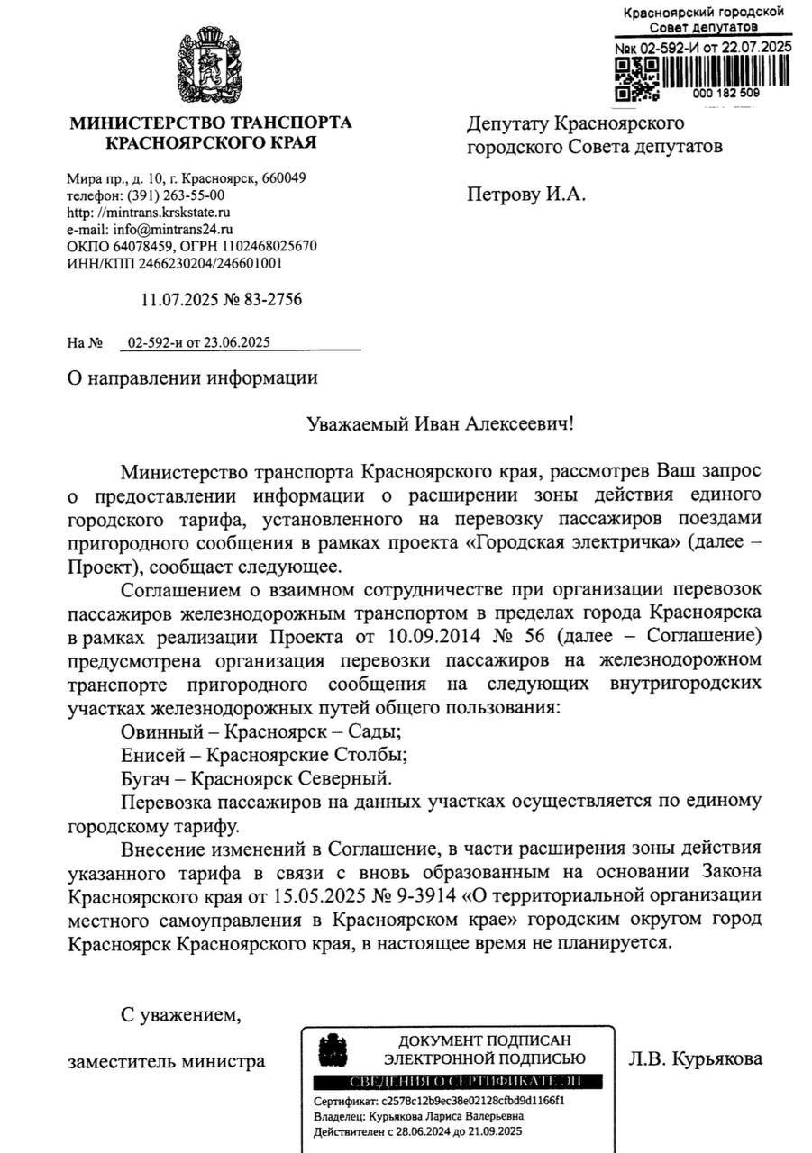 По этому вопросу депутат ЛДПР Иван Петров направил запрос в Министерство транспорта и Красноярскую железную дорогу, на который получил ответ, что стоимость проезда не изменится.