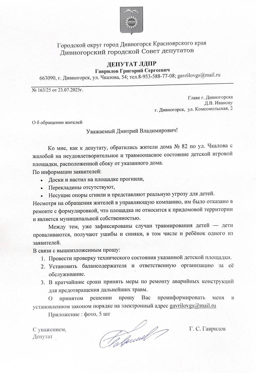 К депутату ЛДПР Григорию Гаврилову обратились жильцы дома по адресу Чкалова, 82. Людей беспокоит безопасность их детей. Площадка для игр рядом с домом находится в аварийном состоянии. Доски и опоры прогнили, перекладины частично отсутствуют. Конструкция буквально разваливается на глазах