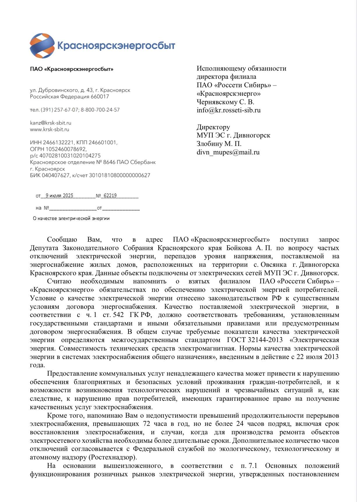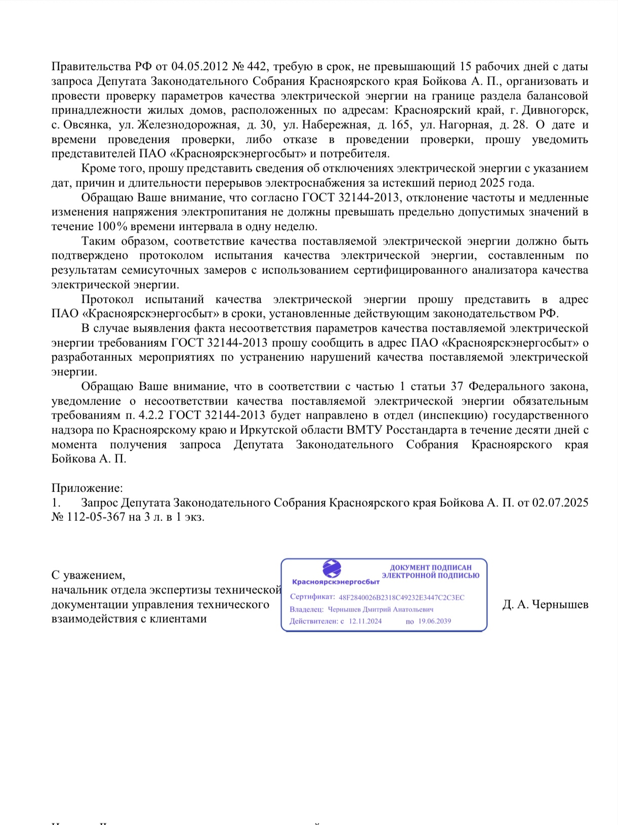 По депутатскому запросу руководителя фракции ЛДПР в Заксобрании Алексея Бойкова Россети и МУПЭС обязаны в течение 15 рабочих дней организовать проверку качества электроснабжения в Овсянке