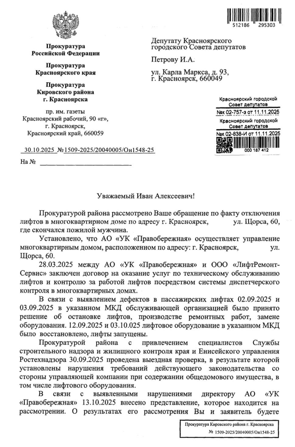 Прокуратура выявила нарушения в работе муниципальной управляющей компании «Правобережная». Поводом для проверки послужил запрос депутата ЛДПР Ивана Петрова. Он уверен: халатность УК могла напрямую сказаться на состоянии пожилого мужчины, которому приходилось пешком подниматься на девятый этаж из-за неисправного лифта