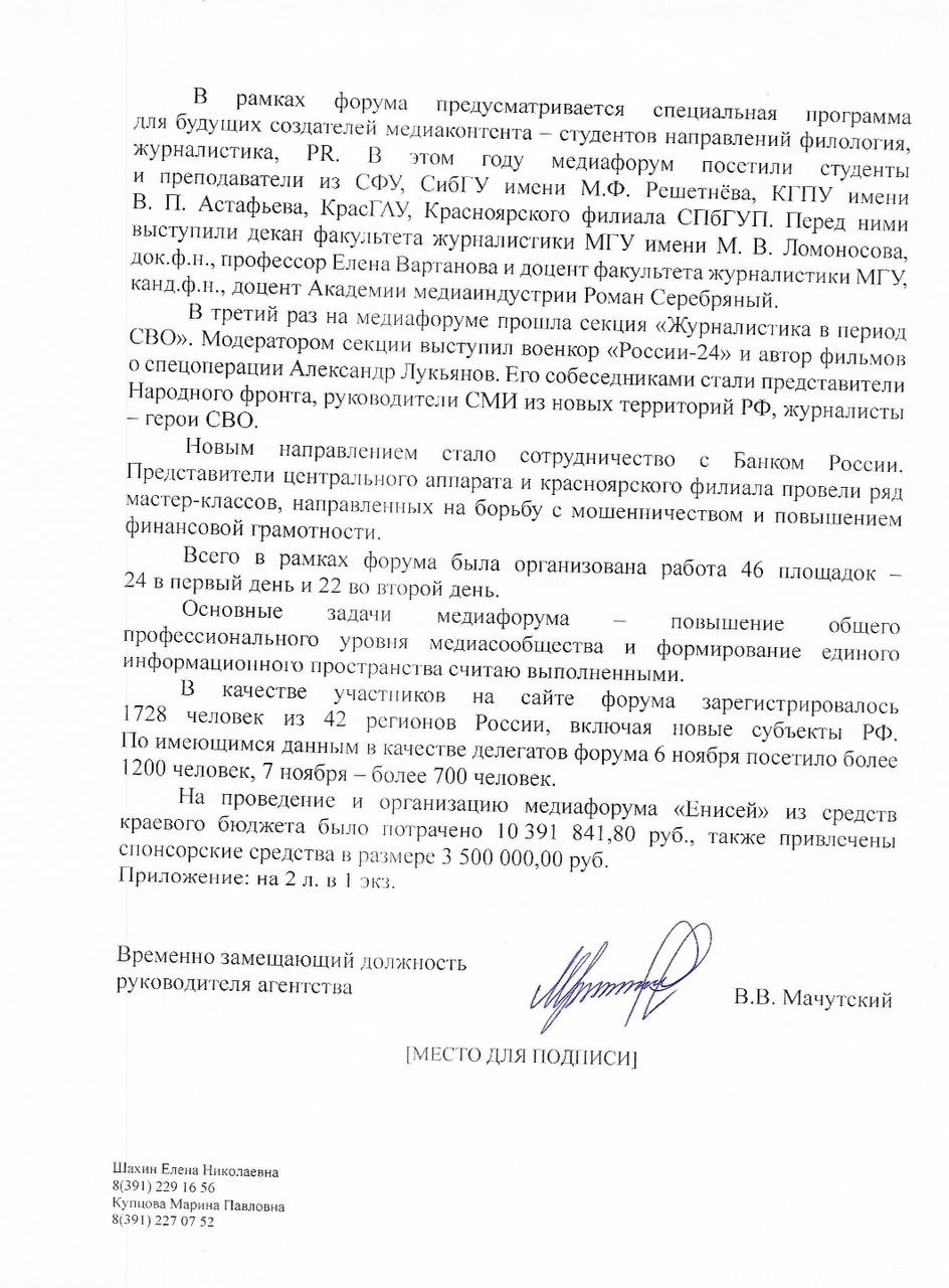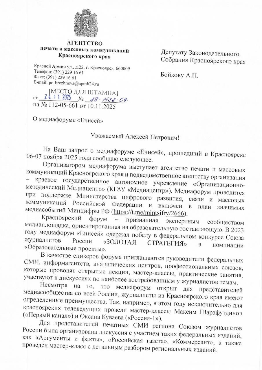 Руководитель фракции ЛДПР в Заксобрании края Алексей Бойков получил официальный ответ от краевого Агентства печати и массовых коммуникаций по поводу целесообразности проведения медиафорума «Енисей» в нынешних условиях. В этом году на мероприятие зарегистрировались более 1700 участников из 42 регионов, работали 46 площадок, приезжали представители федеральных каналов и изданий