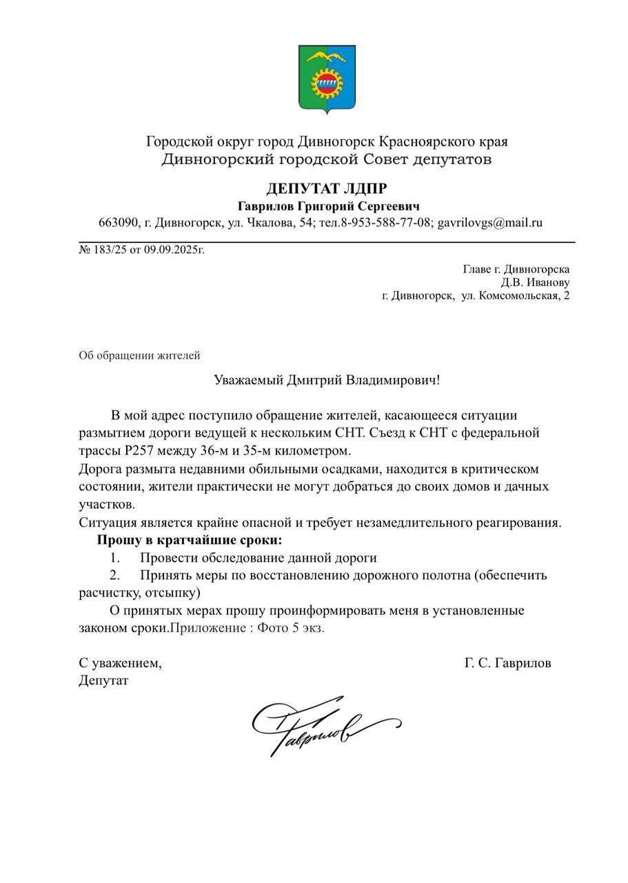 В начале октября к депутату ЛДПР Григорию Гаврилову обратились дачники. После ливней дорогу между 35-м и 36-м километрами трассы Р257 просто развезло. Люди с трудом добирались до участков и домов