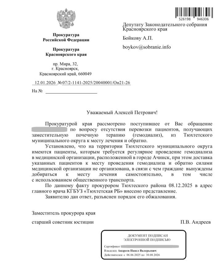 Отчаявшись, женщина обратилась в приемную ЛДПР. После ее обращения Алексей Бойков направил запрос в прокуратуру. По итогам проверки ведомство подтвердило нарушения. Тюхтетская районная больница не организовала доставку нескольких пациентов из района к месту лечения. В адрес главного врача КГБУЗ «Тюхтетская РБ» внесли прокурорское представление.