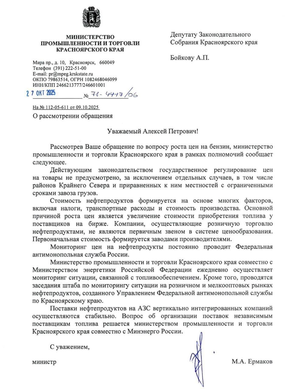 Руководитель фракции ЛДПР в Законодательном собрании края Алексей Бойков получил ответ Министерства промышленности и торговли края по ситуации с топливом. К сожалению, он содержит больше формальностей, чем конкретных действий