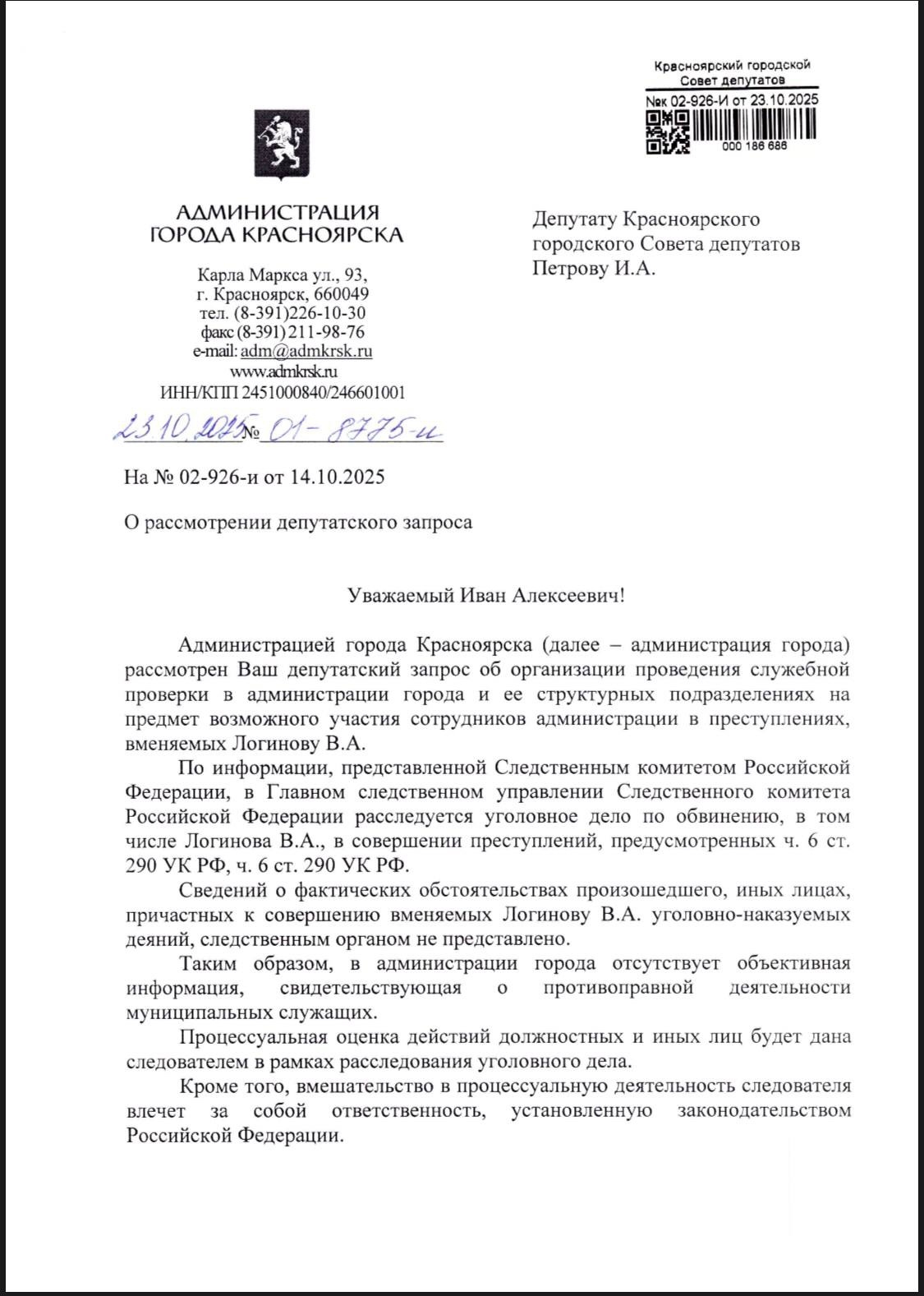 «Честно говоря, с такой позицией я не согласен. Когда нужно провести реформу, выгодную самим чиновникам, — законы и правила меняются в два счёта. А как только речь заходит о возможных коррупционных схемах, сразу появляются «юридические препятствия» и «отсутствие оснований». Считаю, что основания более чем достаточные, и уверен, что большинство красноярцев со мной согласны. Почти весь город говорит, что на строительстве дорог у нас воруют», — подчеркнул Иван Петров.