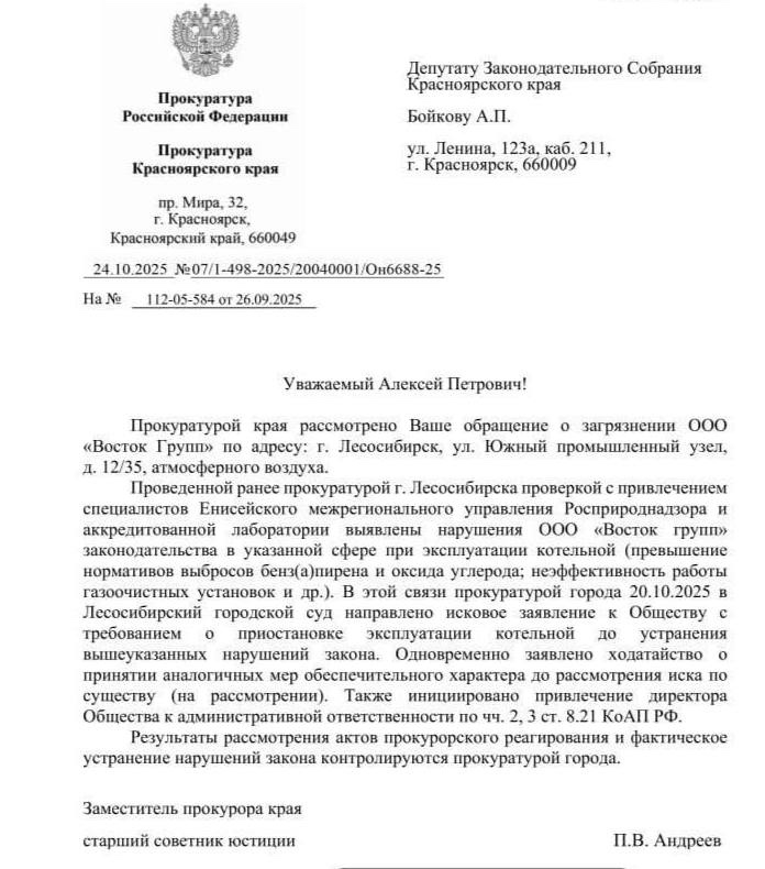 Прокуратура вышла в суд после обращения руководителя фракции ЛДПР в Заксобрании края Алексея Бойкова в защиту жителей «Южки». С этой котельной депутат вместе с лесосибирцами борется давно. Парламентарий инициировал проверку Минэкологии, направлял запросы в местную администрацию и природоохранную прокуратуру