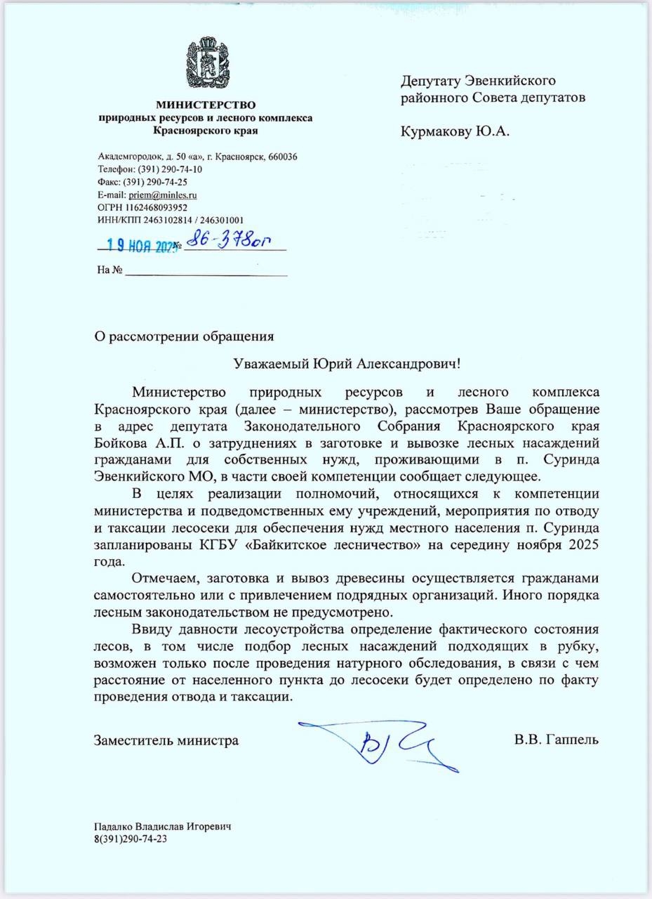 После обращения жителей Юрий Курмаков поднял вопрос на краевом уровне и обратился за содействием к старшему коллеге, руководителю фракции ЛДПР в Законодательном собрании Красноярского края Алексею Бойкову. Парламентарий, в свою очередь, направил официальный запрос в Минприроды края.