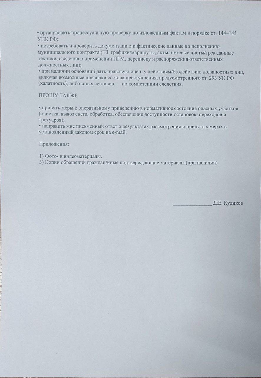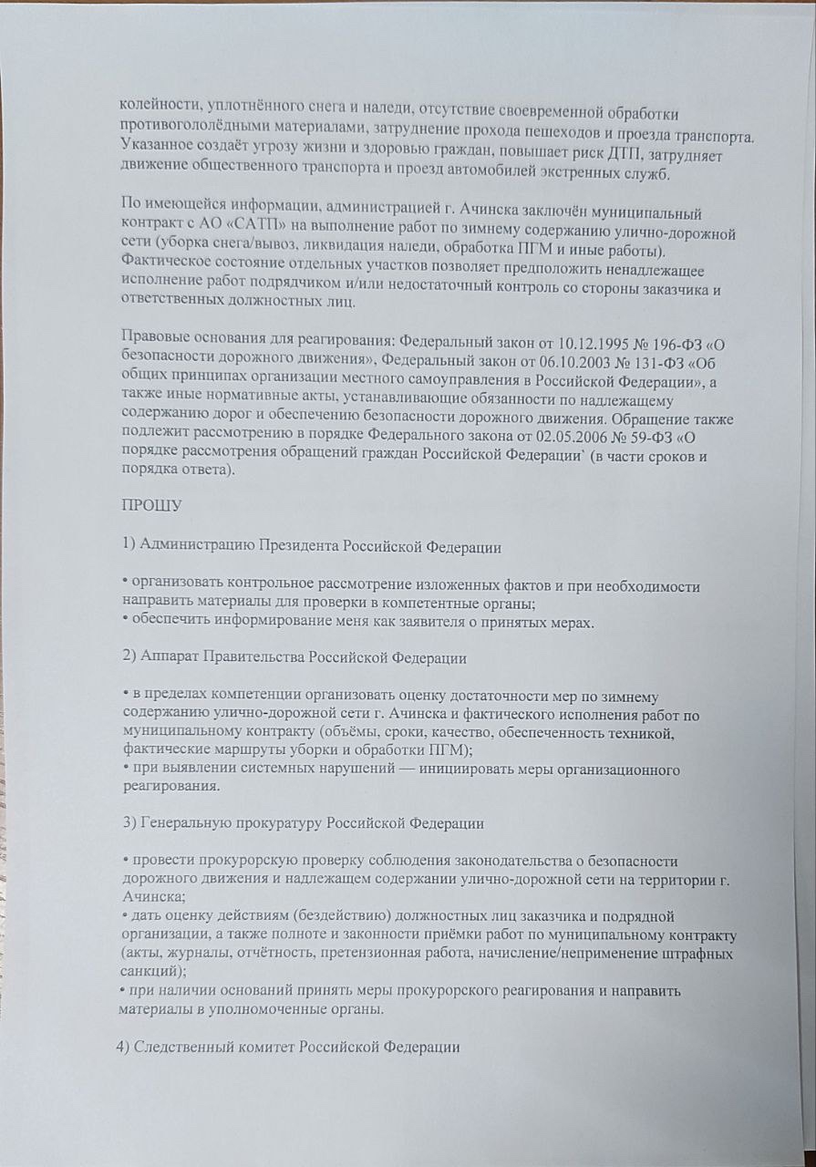 Не добившись ответов от чиновников в муниципальном округе, депутат оформил официальный запрос в профильные инстанции, где попросил разобраться в ситуации. И дать оценку действиям как подрядчика АО «САТП», которое должно проводить работы по зимнему содержанию дорог и улиц города, так и действиям ответственных должностных лиц, принимающих такие работы подрядчика. К обращению народный избранник приложил подписи сотен людей, фото и видео материалы.