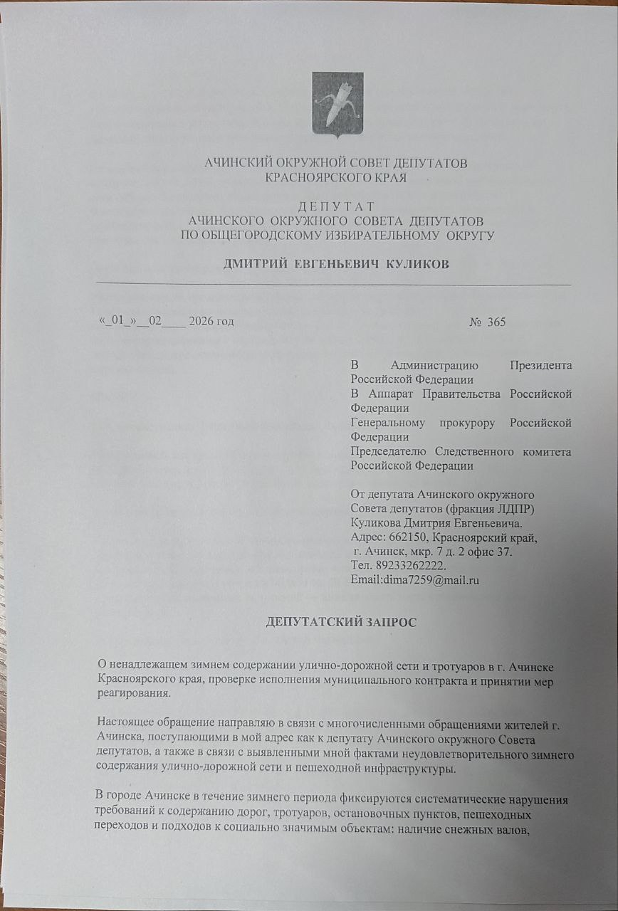 Снег, лёд и бездействие: депутат ЛДПР поднял проблему дорог Ачинска на федеральный уровень