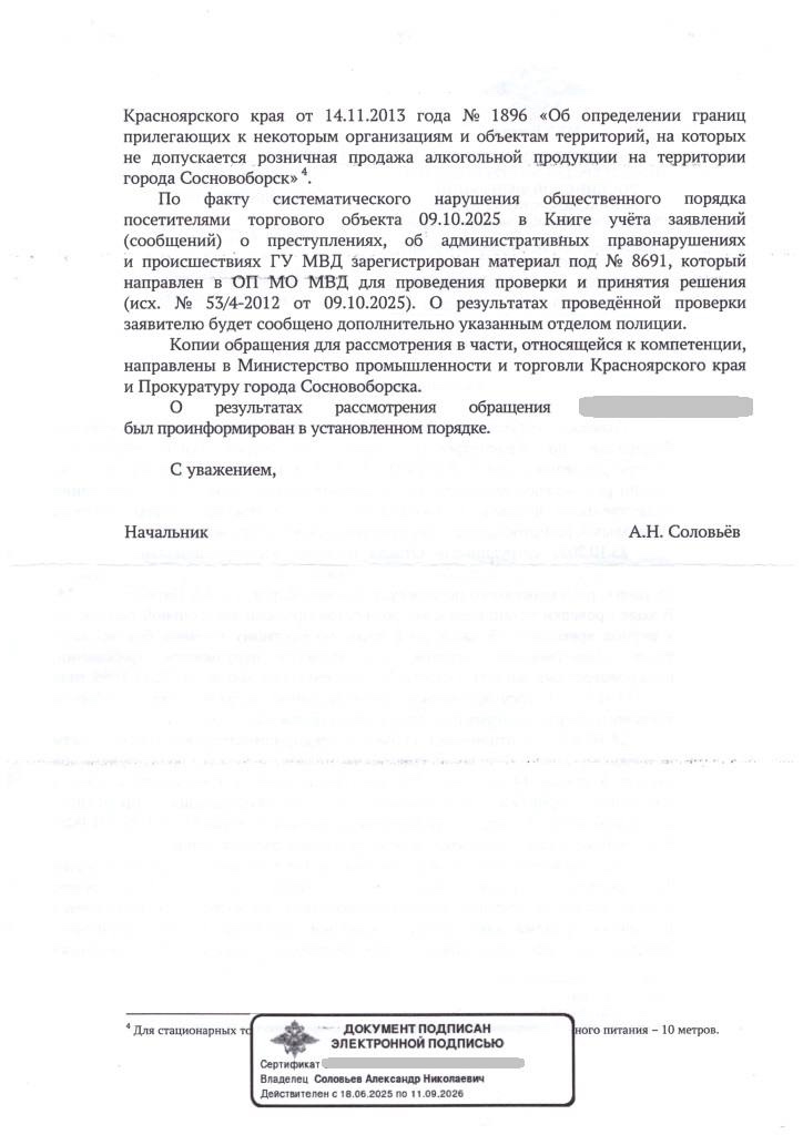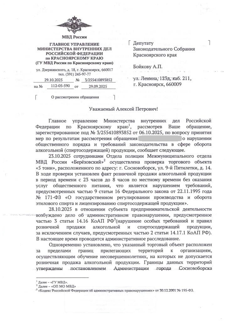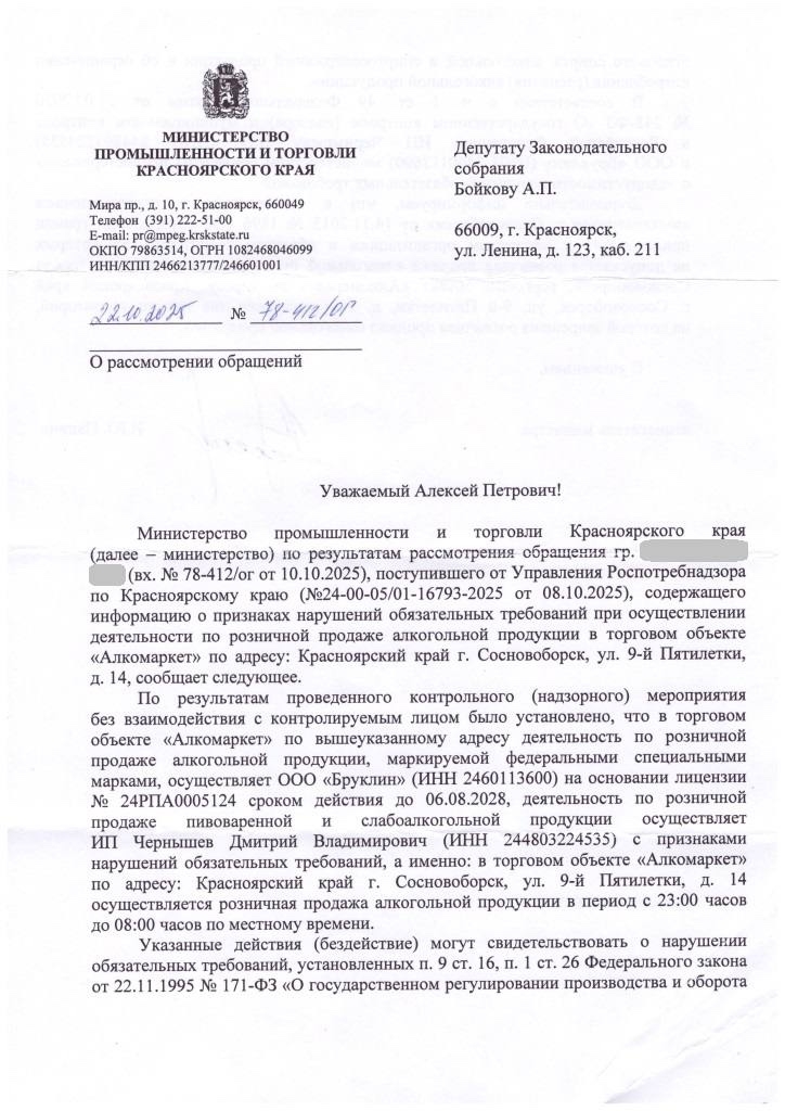 «Механизм борьбы с ночными «наливайками» в Сосновоборске мы уже, можно сказать, отточили. Ранее мы добились закрытия магазина «Мария» на Юности — той самой точки, где годами по ночам продавали спиртное, а люди жили в постоянном страхе и напряжении. На этот магазин с сомнительной репутацией долго закрывали глаза, но в итоге нам удалось остановить его деятельность. Если владельцы алкомаркета у Дома быта продолжат нарушать закон, их ждет та же судьба, — подчеркнул Алексей Бойков. — Хочу сказать большое спасибо сосновоборцам, которые не молчат и не терпят такое соседство. История «Марии» показывает: общественное давление и принципиальная позиция дают результат. Значит, бороться точно есть смысл, и мы будем продолжать это делать».