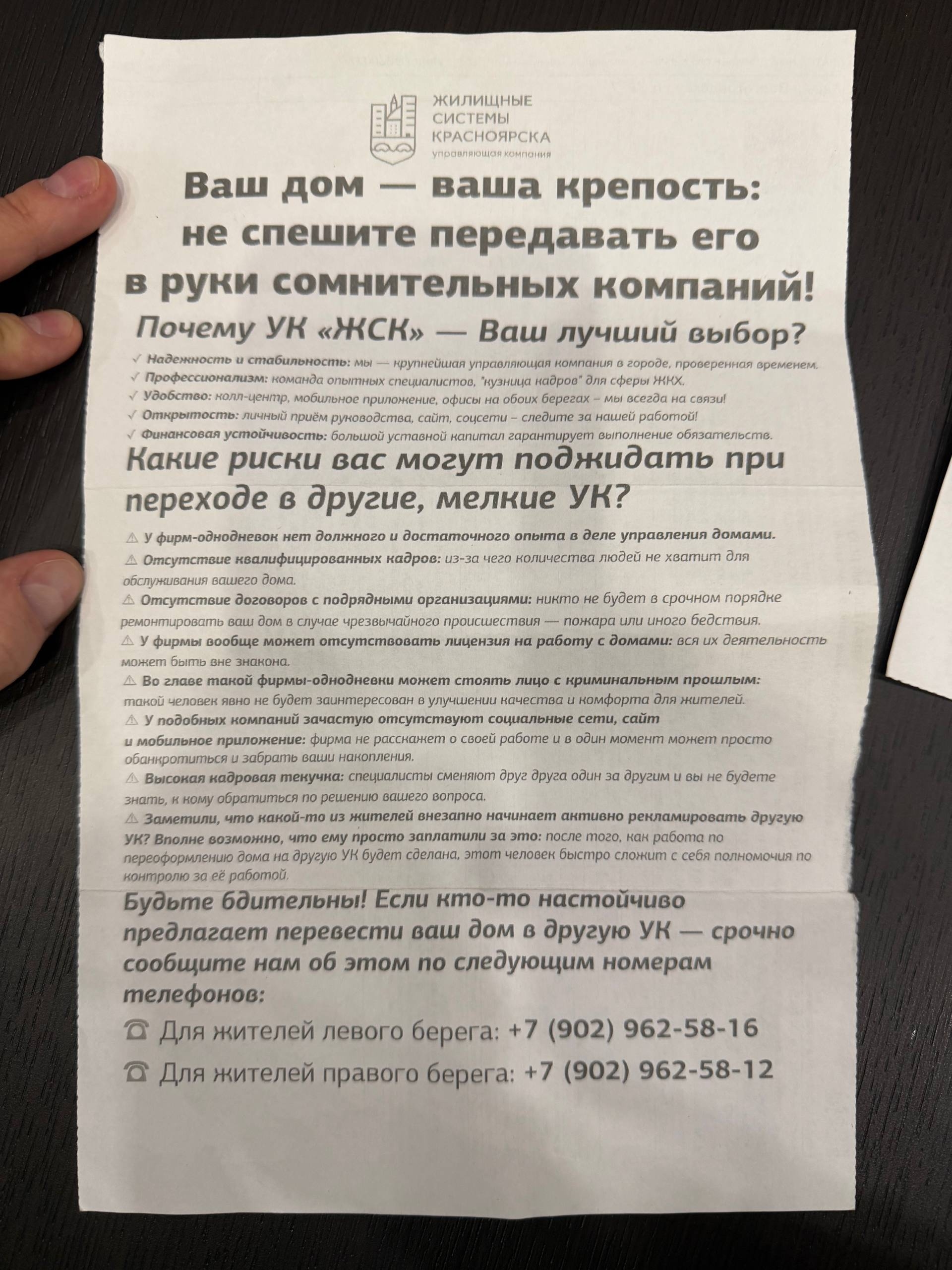 На приём к депутату ЛДПР Ивану Петрову красноярцы принесли платёжки от УК «ЖСК», где на обратной стороне ЖСК просит верить только им и не уходить в другие управляющие компании. Это народный избранник назвал классическим психологическим приёмом, основанным на страхе перед новизной: у нас всё плохо, но мы уже вроде как свои, родные, а у других будет еще хуже