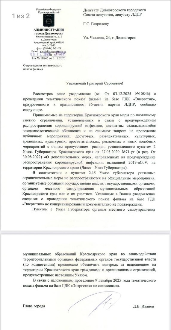 Администрация Дивногорска не согласовала депутату ЛДПР Григорию Гаврилову проведение тематического показа фильма в ГДК «Энергетик», посвящённого 36-летию партии. Власти сослались на «противокоронавирусные ограничения» — те самые, которые в прошлом году почему-то не помешали провести аналогичное мероприятие к 35-летию ЛДПР в том же зале