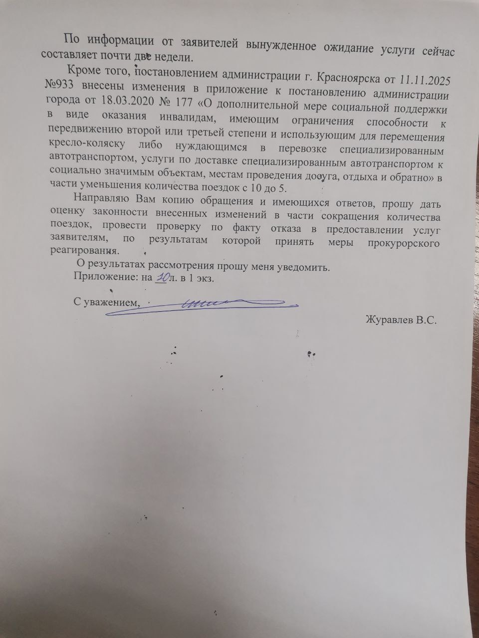 «Это прямое ухудшение условий и нарушение логики социальной поддержки. Направил обращение прокурору Красноярска Валерию Юхновцу с просьбой оценить внесённые изменения и проверить ситуацию по факту ненадлежащего оказания услуг людям с инвалидностью, — рассказал Владимир Журавлев. — Для многих людей с ограниченными возможностями это не «услуга» — это их единственный способ жить полноценно, самостоятельно и достойно. Работу по этому направлению продолжим».