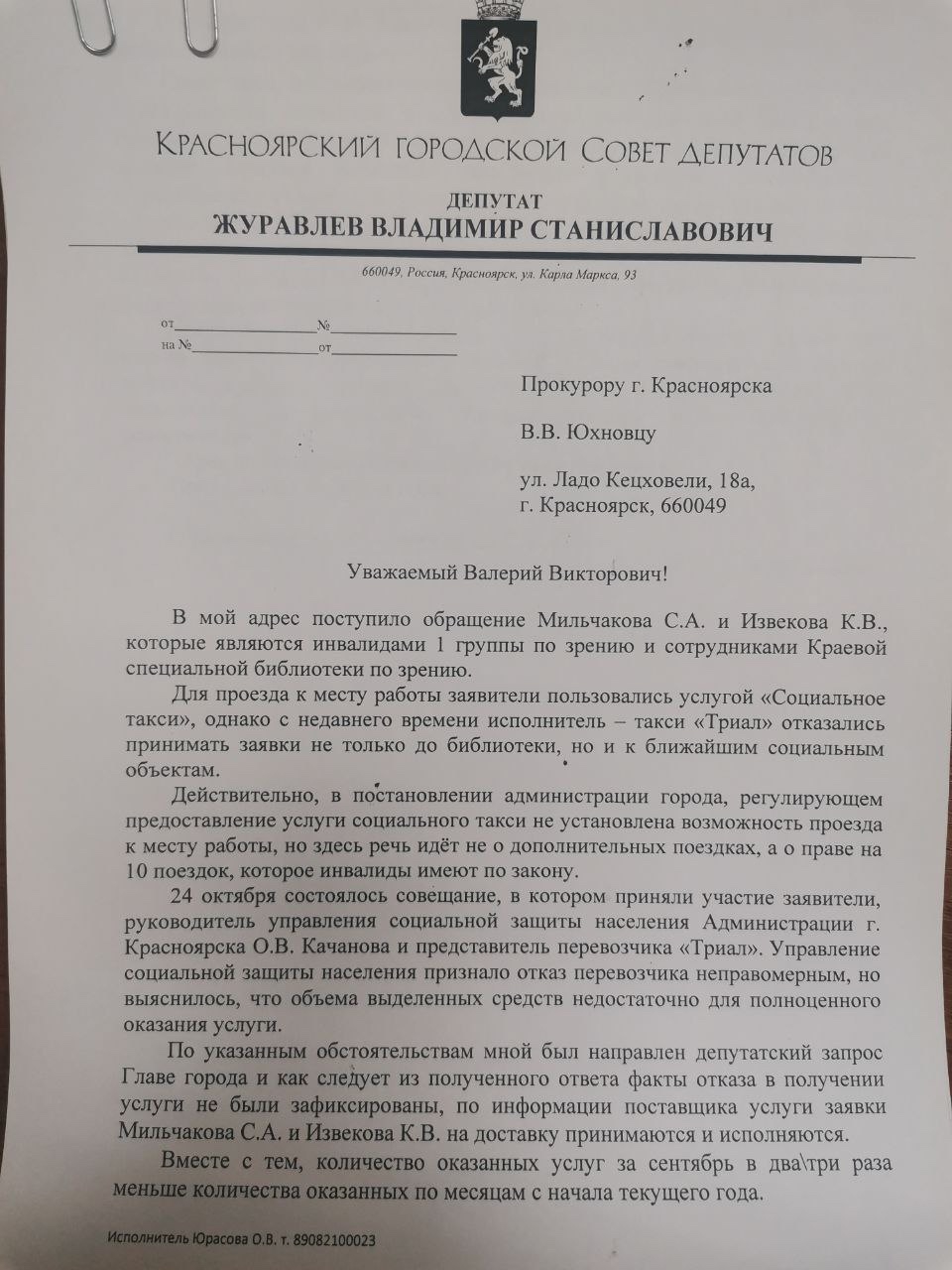 Владимир Журавлев вынес ситуацию на сессию городского Совета и обратился к врио мэра Роману Одинцову. Отказы обслуживать инвалидов — недопустимы. Люди имеют законное право на 10 поездок в месяц, а не «сколько дадут». Кроме того, депутат направил материалы в районную прокуратуру и потребовал от администрации города разобраться.