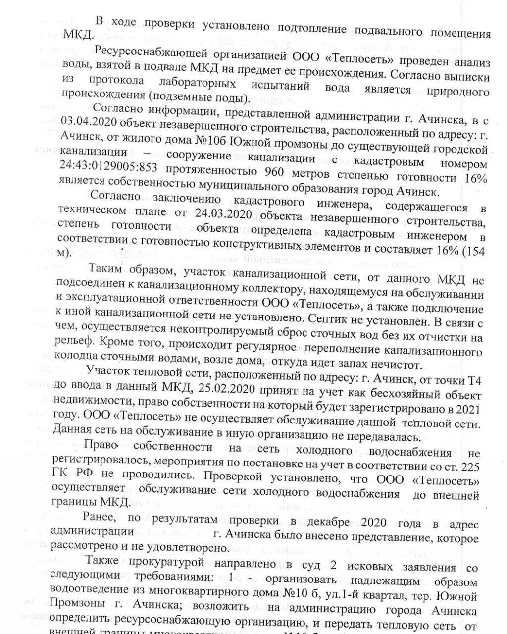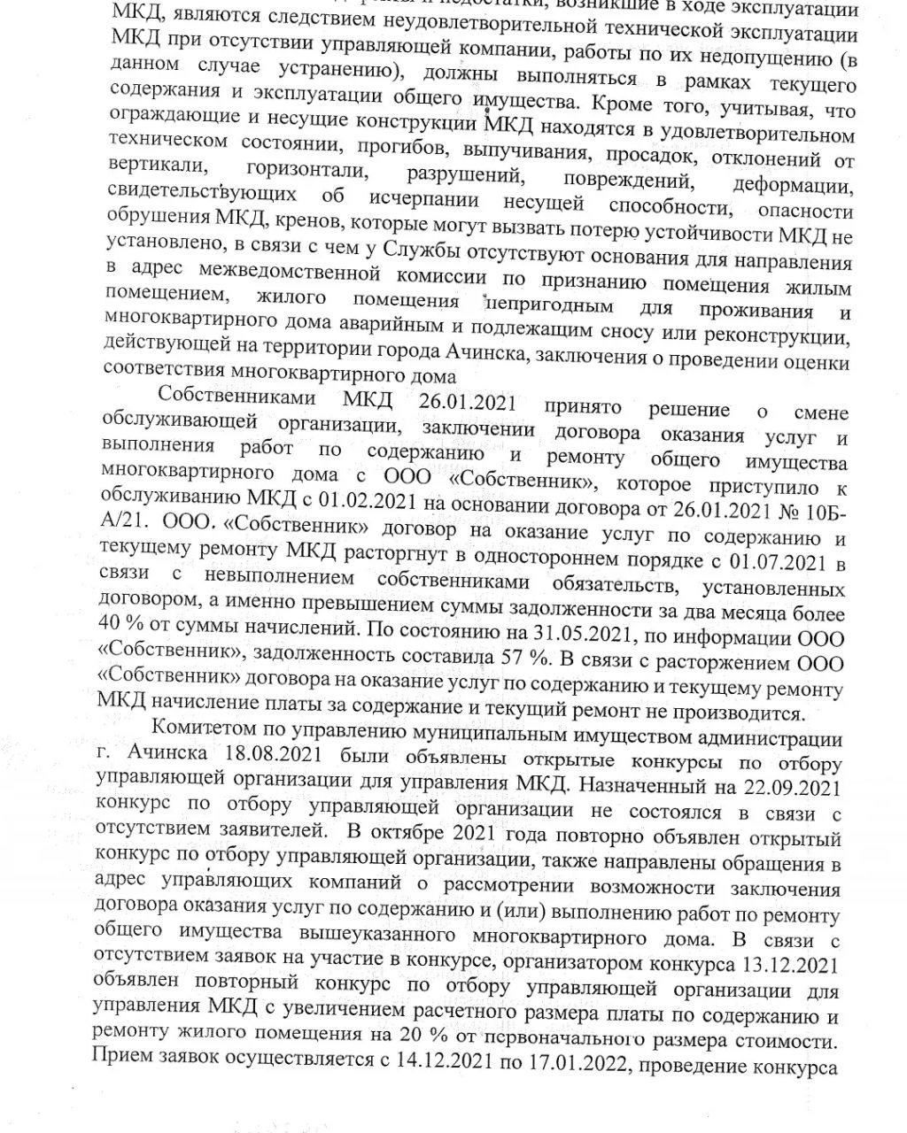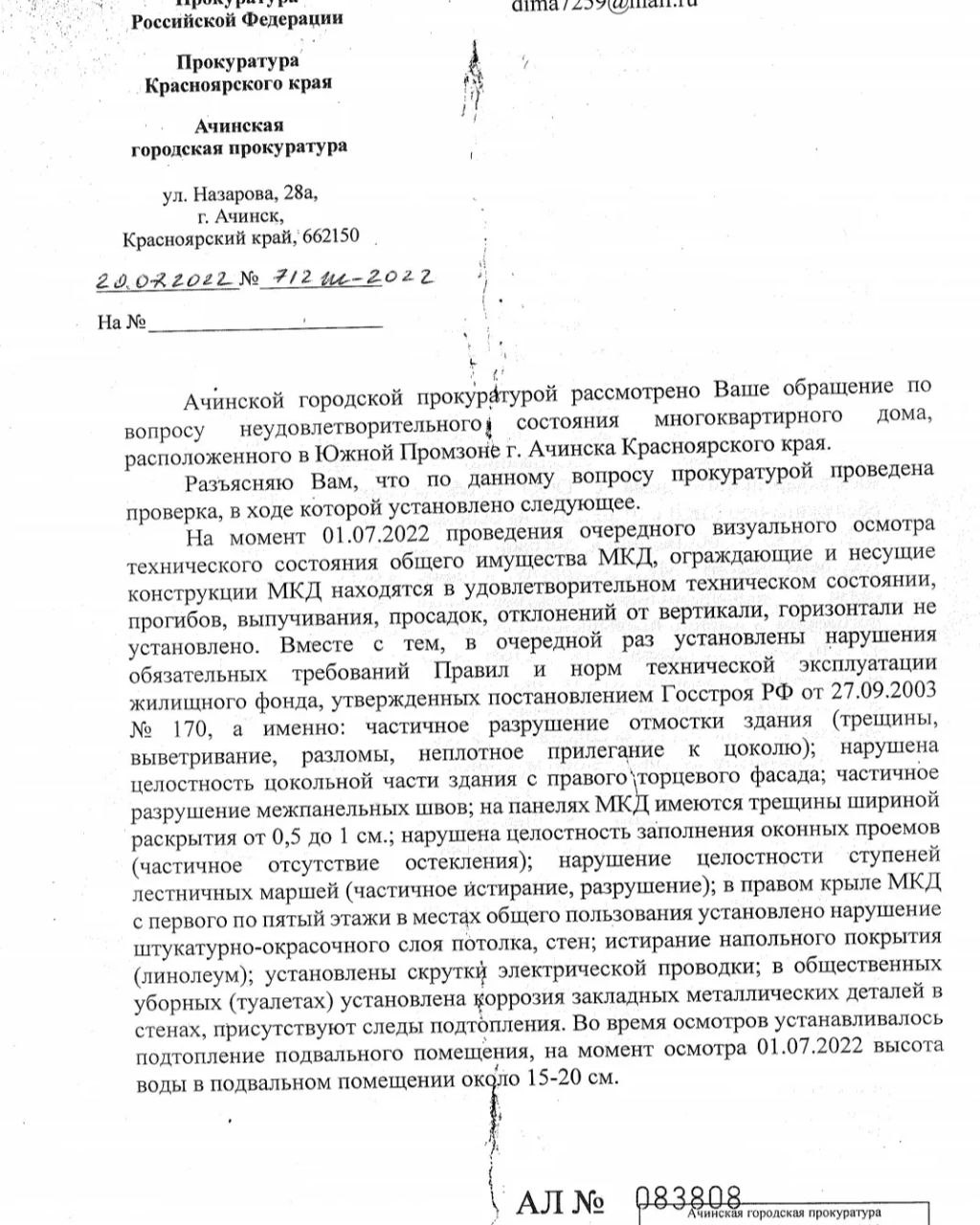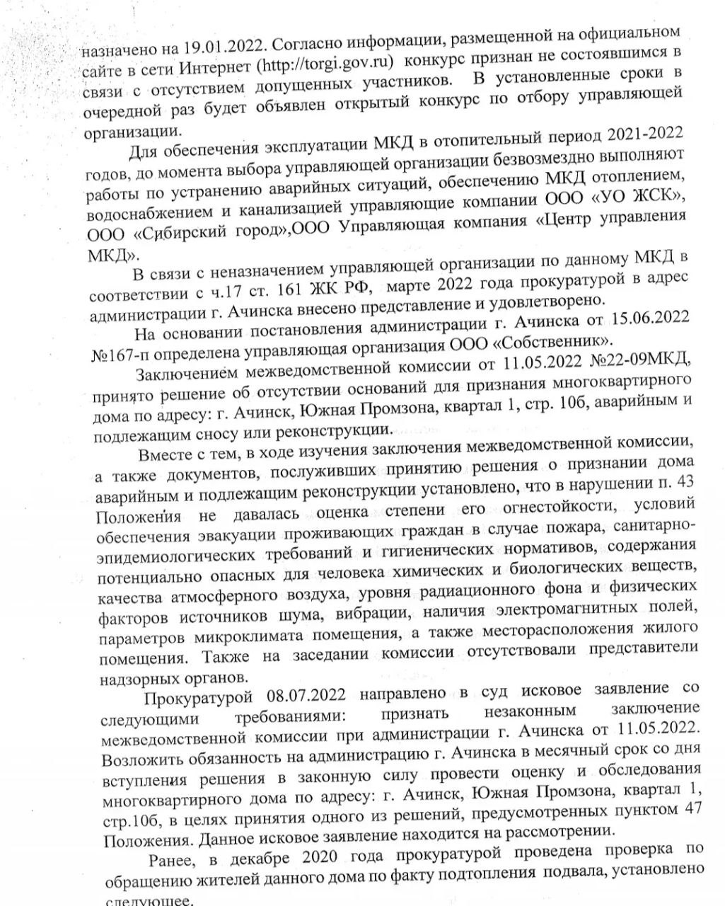 Ачинская прокуратура провела очередной осмотр технического состояния общего имущества многоквартирного дома в Южной Промзоне 10б. Установлено множество нарушений, но основания для признания дома аварийным они не видят.