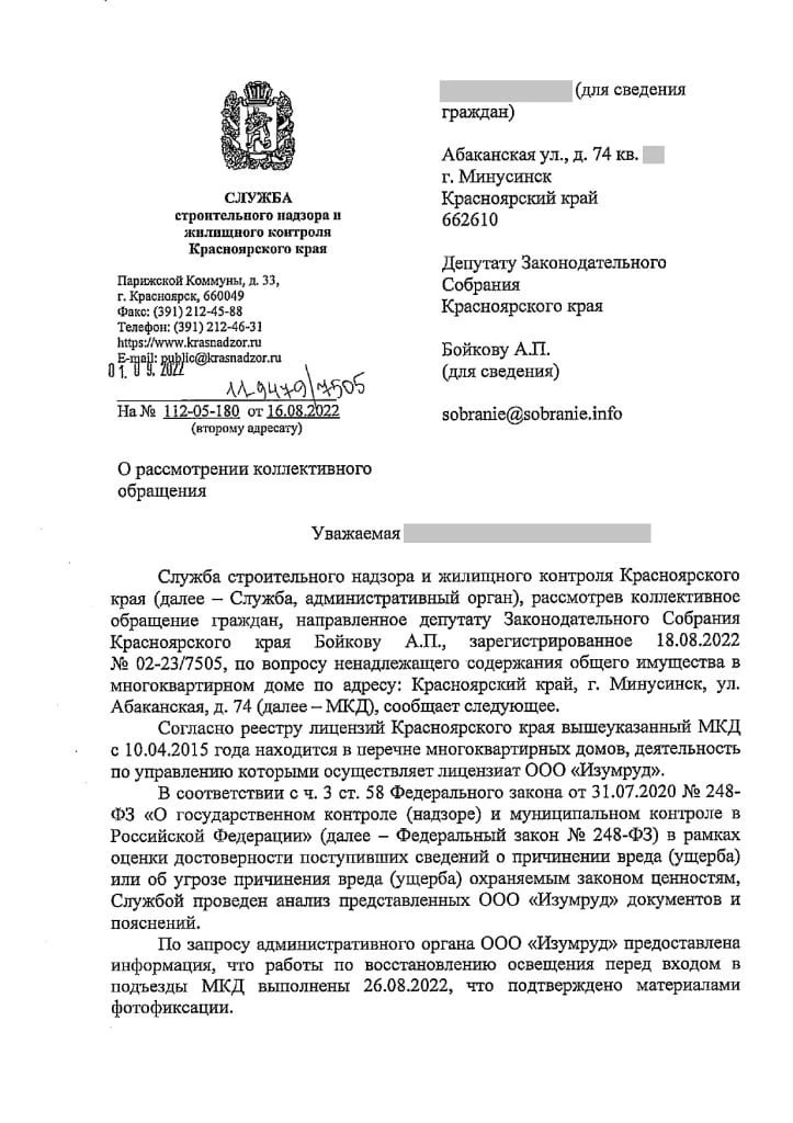 В приёмную депутата ЛДПР Алексея Бойкова поступило коллективное обращение жителей дома № 74 по ул. Абаканской в Минусинске. Люди жаловались на темноту у подъездов и ямы во дворе. Они не раз обращались в управляющую компанию, но безрезультатно.
