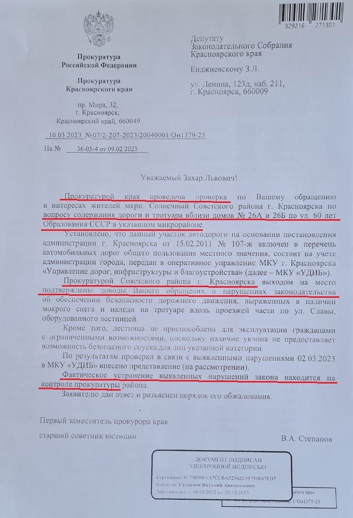 После проверки, инициированной в ответ на запрос депутата, снег и наледь убрали и зафиксировали нарушения законодательства. Управление дорог получило представление прокуратуры и уже летом этого года обещает нарушения устранить и произвести ремонт тротуара с устройством пандуса и перильного ограждения на этом участке.
