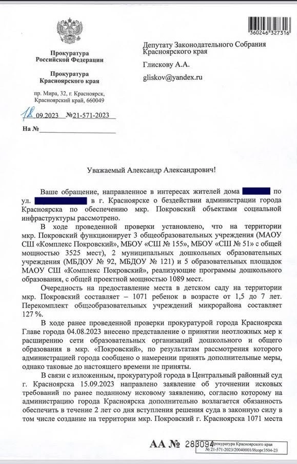 «Прокуратура вышла в суд с требованием обязать администрацию построить школы в ряде микрорайонов. Поскольку в этом списке не было микрорайона Покровский, мы с жителями организовали сбор подписей», — рассказал руководитель фракции ЛДПР в Законодательном собрании края Александр Глисков.
