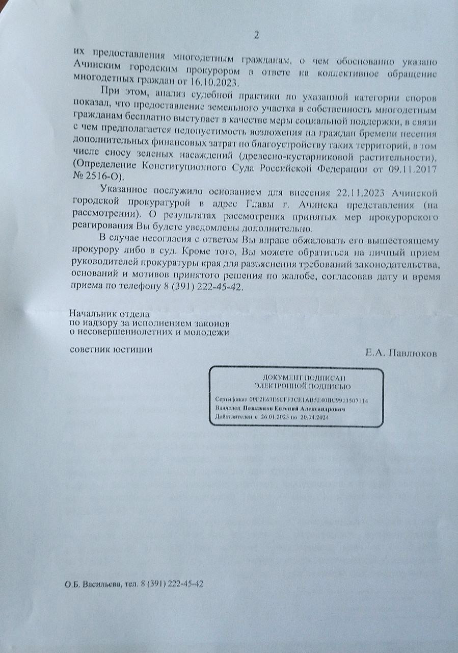 «Я обратился в городскую прокуратуру и следственный комитет, но никаких решений и мер после этого не приняли. Помочь решить вопрос я попросил коллегу — депутата Заксобрания Красноярского края Александра Глискова. Он направил запрос в краевую прокуратуру. И вот пришёл ответ, подтверждающий право семей на благоустроенные земельные участки. Предоставление участков — мера социальной поддержки, поэтому несение дополнительных финансовых затрат по благоустройству этих территорий не должно возлагаться на плечи семей», — делится народный избранник.