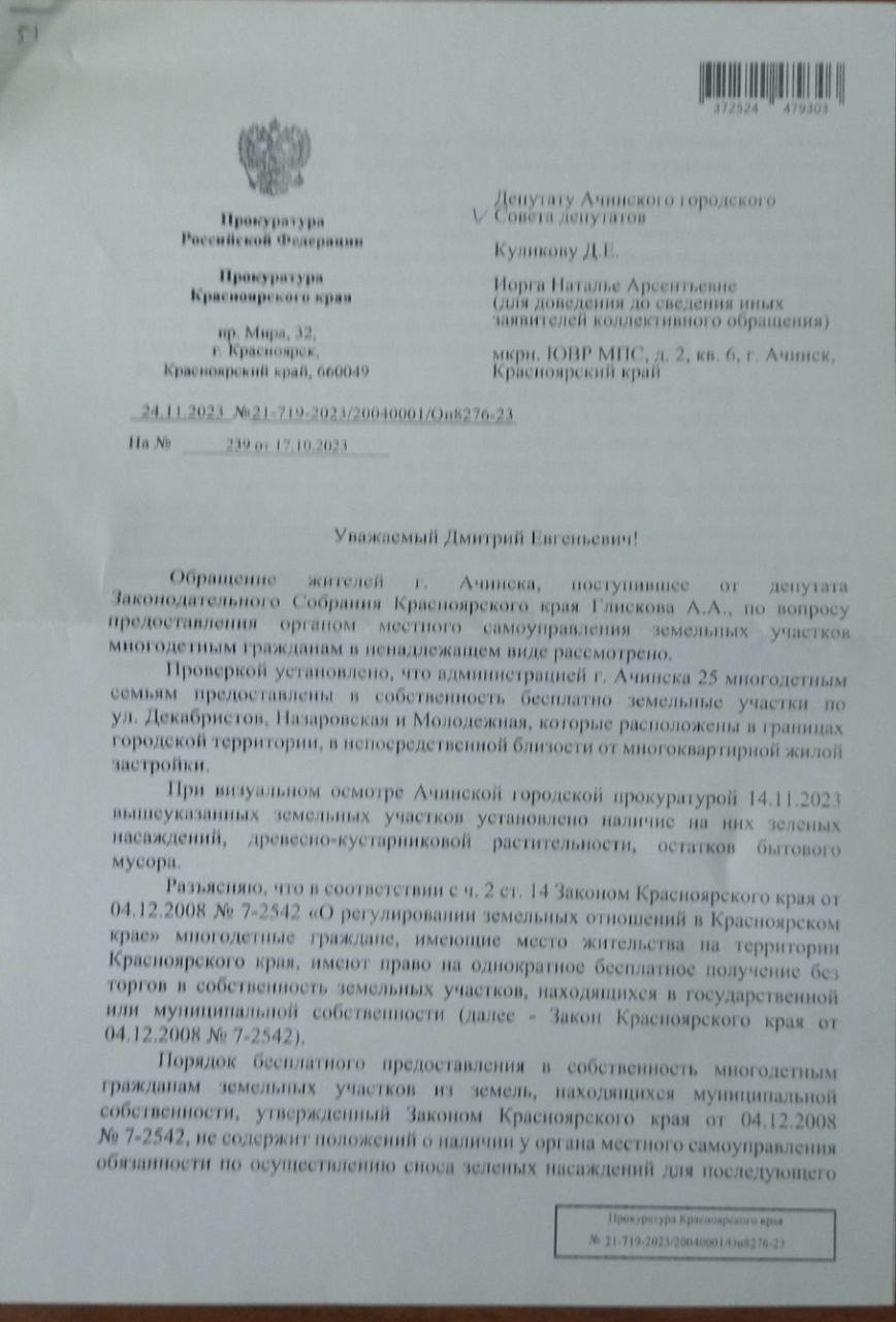 Дмитрий Куликов обратился к администрации города Ачинска с просьбой принять меры по благоустройству предоставленных участков и привести их в соответствующее состояние.