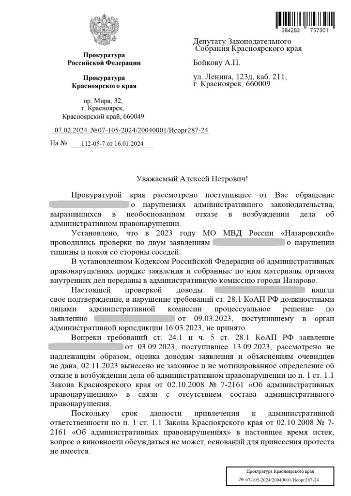 А вот прокуратура после запроса депутата ЛДПР Алексея Бойкова обнаружила удивительные, на первый взгляд, обстоятельства: в прошлом году полиция собрала два материала на шумную семью и передала их для рассмотрения в административную комиссию Назарово, соответственно в марте и сентябре. По первому материалу с марта по январь комиссия так и не вынесла никакого решения, а по второму, сентябрьскому материалу, в ноябре вынесли «отказное» определение.